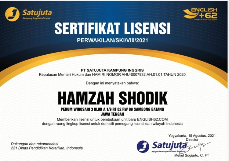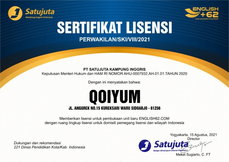 Setelah mengikuti pelatihan ini, Anda langsung menjadi mitra resmi / pemilik cabang PT Satujuta Kampung Inggris di kecamatan tinggal Anda — tanpa biaya tambahan!